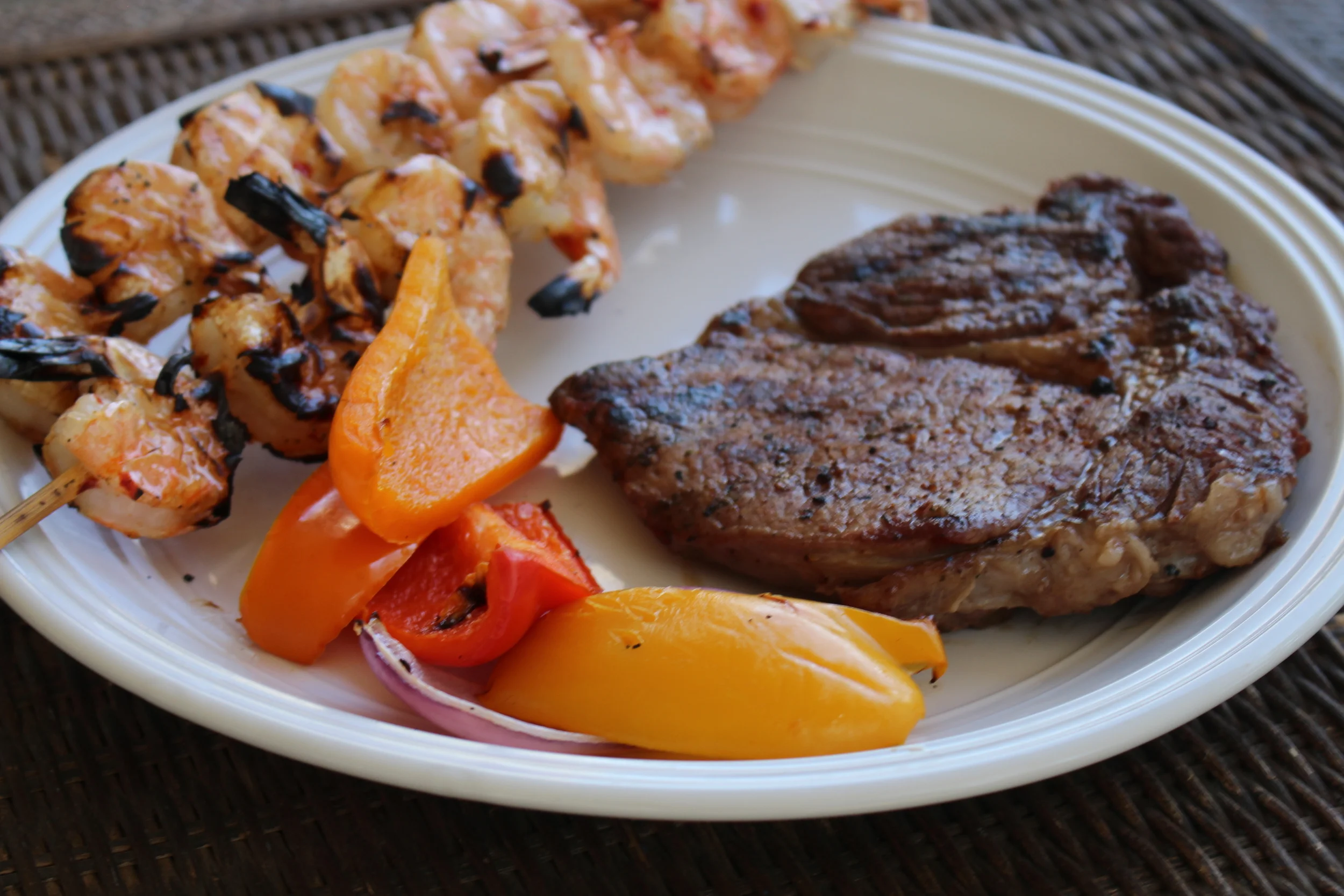 Dinner: Had a BBQ! SO delicious! Shrimp and Ribeye with some grilled Peppers and Onion!
